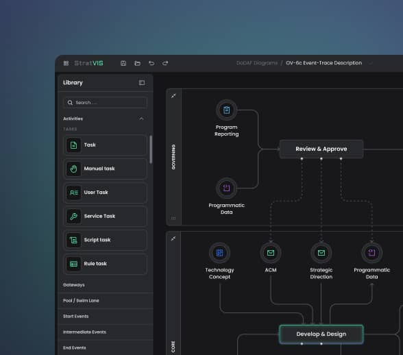 Comprehensive platform for modeling complex organizational architectures using military and government-standard frameworks for federal agencies and defense departments.